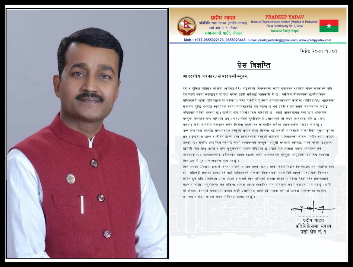 पर्सा क्षेत्र नम्बर १ का साँसद प्रदीप यादवले जीवन रक्षाका लागि खाद्यान्न आपुर्ती र रेपिड टेस्टको मांग गरेका छन् | बुधबार प्रेस बिज्ञप्ति जारि गर्दै सांसद यादवले वीरगन्जको छप्कैयास्थित मस्जिदसंगै रहेको यतिमखानामा बसेका ३ जना भारतीय मुस्लिम धर्मप्रचारकहरुमा कोरोना (कोभिड–१९) भाइरसको संक्रमण पुष्टि भएपछि स्वभाविक रुपमा मानिसहरुमा भय ब्याप्क छ भने छप्कैया क्षेत्र यतिखेर सिल गरिएको छ। आवश्यक बस्तुको पसलहरु बन्द गरिएका भएकाले सवधानीको दृष्टीकोणले प्रसाशनको यो कदम आवश्यक पनि रहेको तर, यसबाट केही मानवीय संकटहरु समेत सिर्जना भएकोतिर सम्बन्धीत सबैको ध्यानाकर्षण गराएका छन् ।