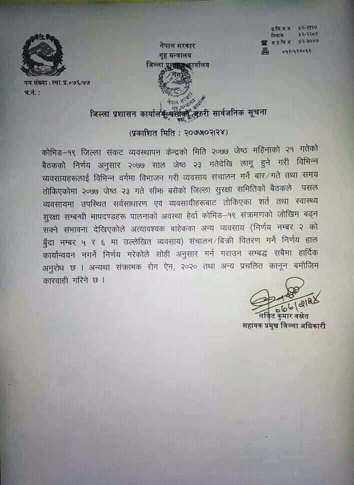 त्यसको लागि जिल्ला प्रशासन कार्यालयले गते र समय पनि तोकेको थियो । तर २३ गते साँझ बसेको कोभिड १९ जिल्ला संकट व्यवस्थापन केन्द्रको बैठकले व्यवसायी तथा सेवाग्राहीले तोकेको स्वास्थ्य सुरक्षा सम्बन्धि मापदण्ड तथा सर्तहरुको पालनाको अवस्था हेर्दा संक्रमण फैलिन सक्ने देखिएको भन्दै तत्कालका लागि यस भन्दा पहिला प्रकाशित गरिएको निर्णय नं. २ को बुन्दा नम्बर ५ र ६ मा उल्लेख रहेको व्यवसाय बन्द गर्ने निर्णण गरेको छ ।