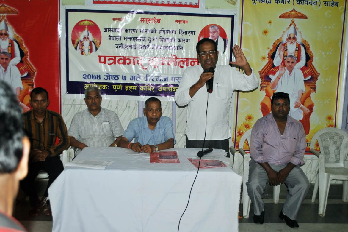 पूर्ण ब्रम्ह कविर उपासक समाज नेपाल पर्साले आज वीरगन्जमा आयोजना गरेको पत्रकार सम्मोलनमा समाजको नेपाल संयोजक रामचन्द्र महतोले प्रबचन सुन्न गएका ८ जना नेपाली माथि राजद्रोह र अन्य १८ जनालाई समान्य तारेखमा राखी भारत सरकारले दु:ख दिएको र पिडित नेपालीलाई राहत दिन नेपाल सरकारलाई पहल गर्न आग्रह गर्दा समेत सरकारले कुनै सुनुवाई नगरेको गुनासो गर्नु भयो ।