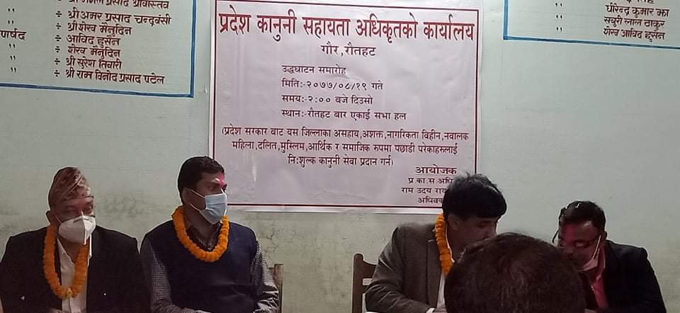 कानूनी सहायता अधिकृत अधिवक्ता राम उदय राय यादवको सभापतित्वमा संपन्न भएको उदघाटन कार्यक्रममा नेपाल बार एसोशिएसन का अध्यक्ष राजाराम यादव , जिल्ला न्यायधिवक्ता सुभास कुमार भटराई , पूर्व अध्यक्ष राम सहाय राय यादव , अधिवक्ता आफताव आलम लगायतका कानून व्यवसायीहरुले आ आफ्नो विचार व्यक्त गरेका थिए ।