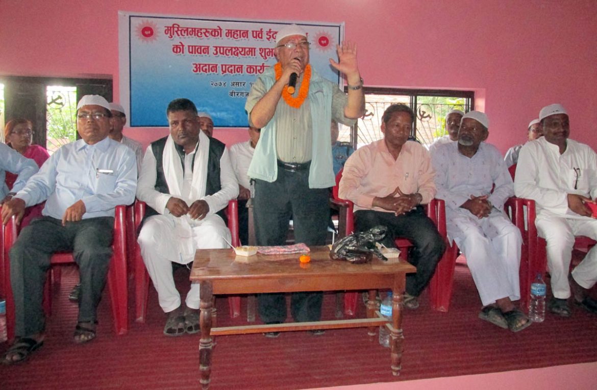 नेकपा एमाले वीरगन्ज नगर कमिटिका संयोजक उसमान अन्सारीको अध्यक्षतामा सम्पन्न भएको शुभकामना आदान–प्रदान कार्यक्रममा एमाले नेता एवम सांसद रामचन्द्र साह, नागेन्द्र चौधरी, राजकुमार गुप्ता लगायतका वक्ताले ईद पर्वको शुभकामना दिदै जनताको हितैसि र जन विरोधी पार्टीको पहिचान गर्न सर्वसाधारणलाई आग्रह गर्नु भयो ।
