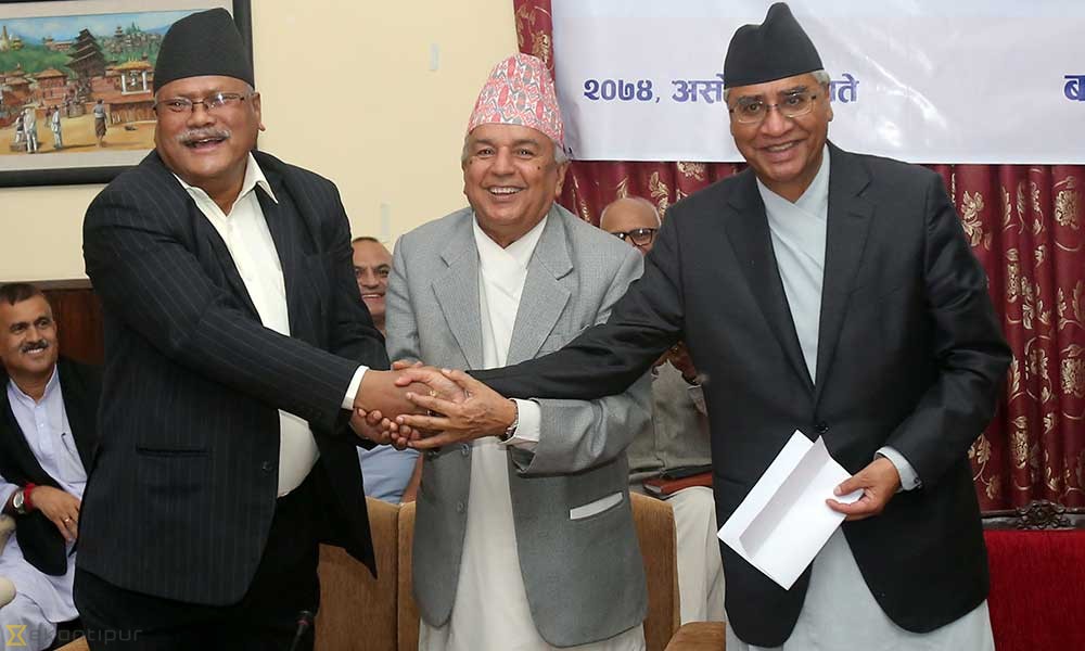 काठमाडौं, असोज ३० । नेपाली कांग्रेस र नेपाल लोकतान्त्रिक फोरमबीच पार्टी एकता घोषणा गरिएको छ ।दुई दलबीच हिजै पार्टी एकता हुने भनिए पनि बेलुका अबेरसम्म सबै विषयमा सहमति जुट्न नसकेपछि एकताको घोषणा आज गरिएको हो ।एकता घोषणामा नेपाल लोकतान्त्रिक फोरम कांग्रेसमा समाहित भएको छ ।