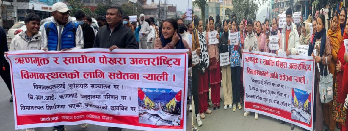 चिनिया महत्वकांक्षी रुपमा रहेको आर्थिक सहयोग बिआरआई परियोजना मुलुकको लागी ऋणजाल भएको भन्दै पोखरामा प्रदर्शन गरिएको हो । राष्ट्रीय एकता अभियान, पोखराले ऋणमुक्त ऱ स्वाधीन पोखरा अंतराष्ट्रीय विमानस्थलको लागि सचेतना रैली निकाल्दै प्रदर्शन गरेको छ ।