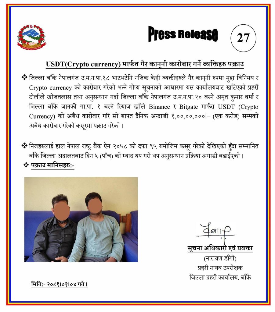 जिल्ला प्रहरी बाँकेले गैर कानुनी रुपमा मुद्रा विनिमय र क्रिप्टोकरेन्सी (Crypto Currency) कारोबारमा संलग्न दुई जनालाई पक्राउ गरेको हो।