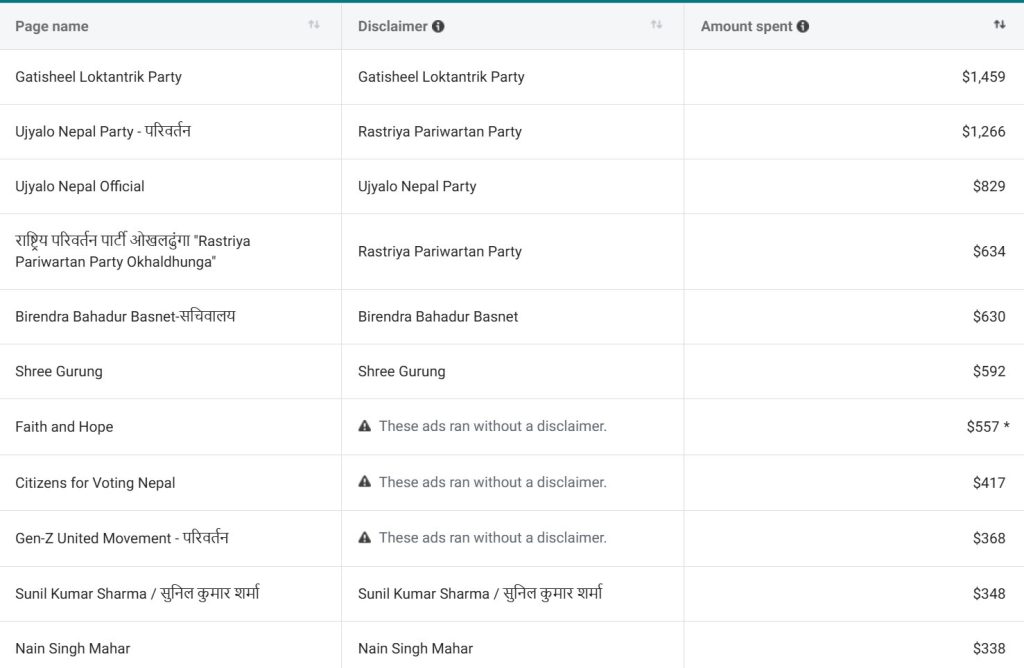 पछिल्लो समय उम्मेदवारहरूले आफ्नो आधिकारिक पेज बाहेक तेस्रो पक्ष वा अन्य नामका पेजहरूबाट ‘स्पोन्सर्ड’ विज्ञापन गर्ने प्रवृत्ति ह्वात्तै बढाएका छन्। मेटाको ‘एड लाइब्रेरी’ ले सार्वजनिक गरेको पछिल्लो तीन महिनाको तथ्याङ्कले पनि यसलाई पुष्टि गर्छ। तथ्याङ्क अनुसार, विज्ञापनमा खर्च गर्नेमा राजनीतिक दल र तिनका उम्मेदवारहरू अग्रस्थानमा छन्। यस अवधिमा ‘गतिशील लोकतान्त्रिक पार्टी’ले १,३४१ डलर, ‘उज्यालो नेपाल पार्टी’ले १,२४४ डलर र ‘उज्यालो नेपाल अफिसियल’ले ८२९ डलर खर्चेर शीर्ष स्थान ओगटेका छन्। यसबाहेक राष्ट्रिय परिवर्तन पार्टी, वीरेन्द्रबहादुर बस्नेत सचिवालय, विभिन्न अभियान समूह र स्वतन्त्र उम्मेदवारहरूले पनि फेसबुक विज्ञापनमा ठुलो धनराशि खर्चिएको देखिन्छ। तर, देखिने यो खर्च वास्तविक खर्चको सानो हिस्सा मात्र भएको विज्ञहरूको दाबी छ।