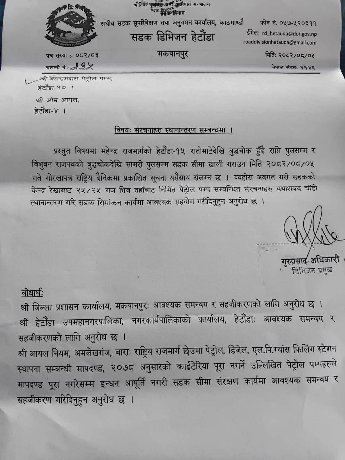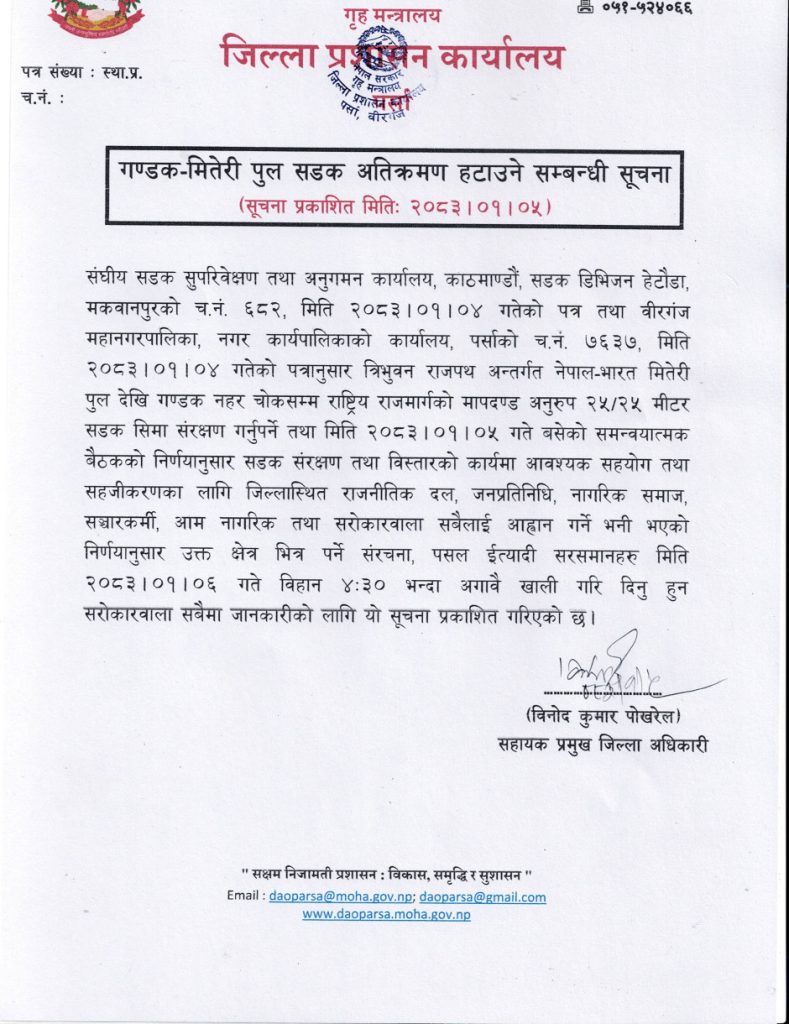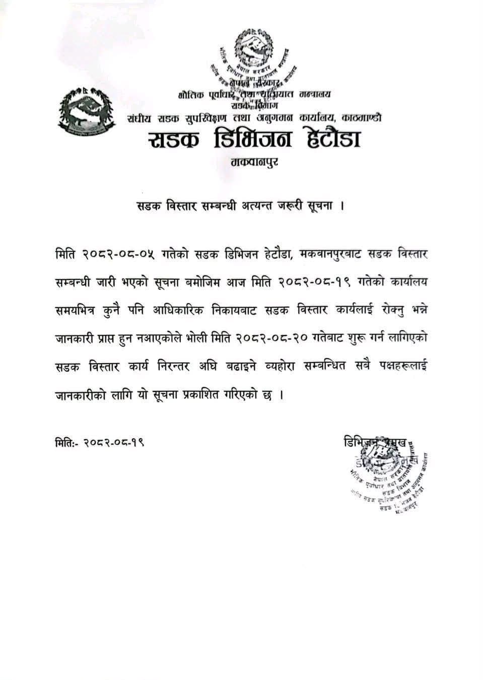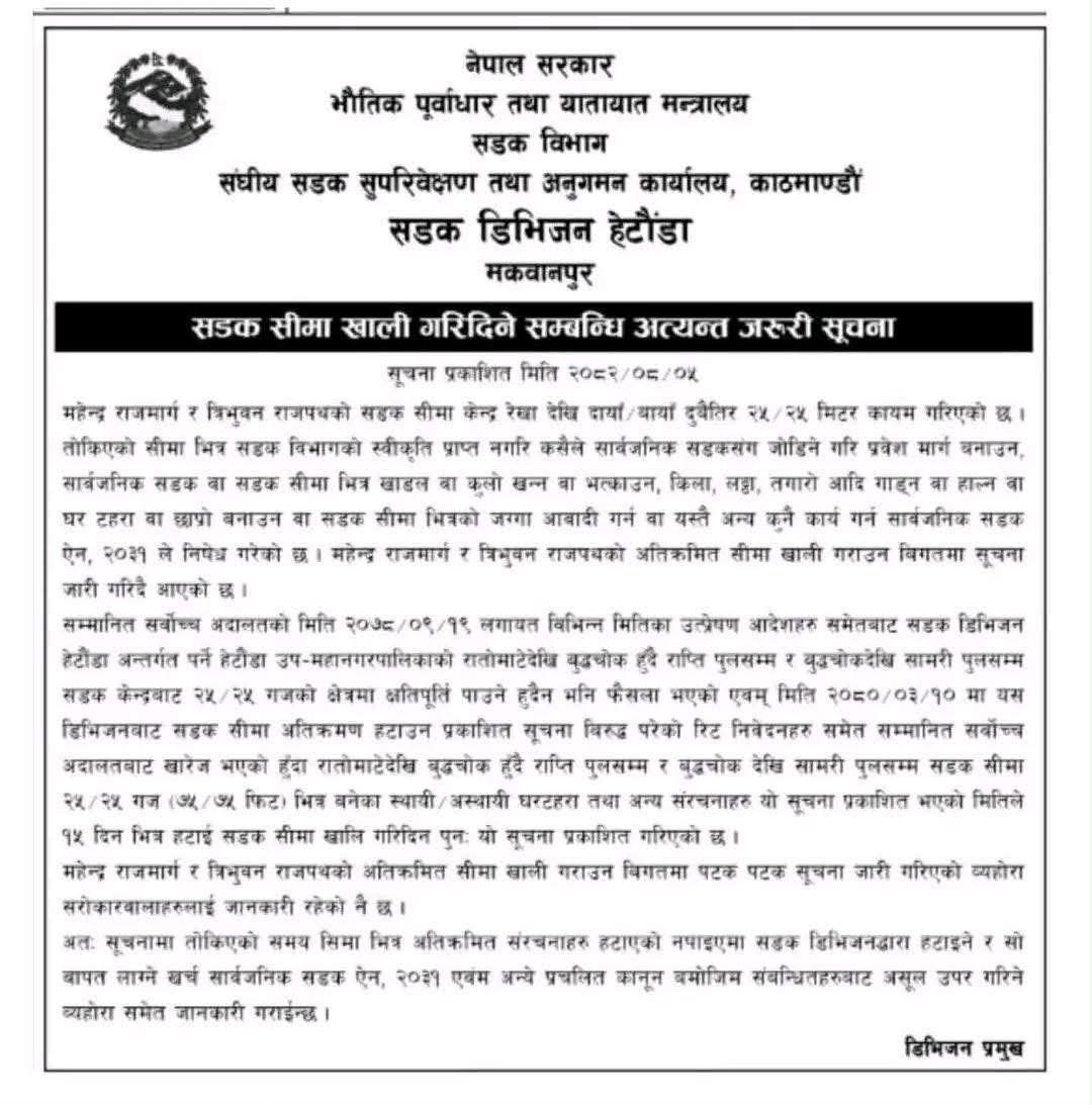 हेटौंडामा सडक सीमा खाली गर्न घरधनी तथा व्यवसायीलाई १५ दिनको पूर्वसूचनासहित आवश्यक सहजीकरण गरिएको थियो भने वीरगञ्जमा पूर्वसूचना विना नै २४ घण्टाभन्दा कम समय तोकेर रातारात संरचना खाली गर्न उर्दी जारी गरिएको छ।