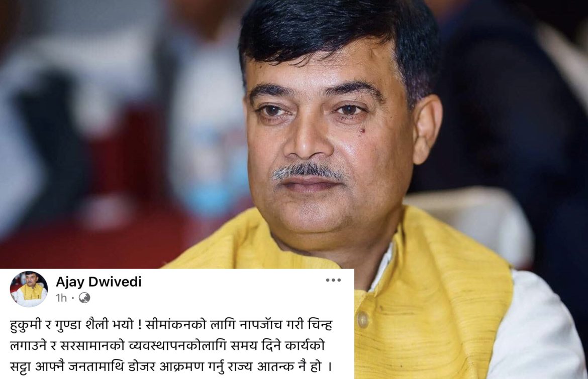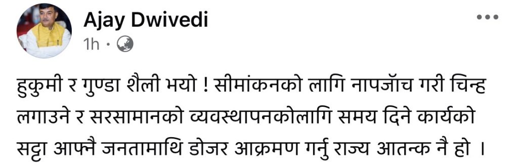 सीमाका संरचना भत्काउन डोजर चलाइएको घटनालाई लिएर नेपाली कांग्रेस पर्साका नेता तथा पूर्व संविधानसभा सदस्य अजय द्विवेदीले कडा आपत्ति जनाएका छन्। स्थानीय प्रशासनको बलमिच्याइँपूर्ण कदमप्रति आक्रोश व्यक्त गर्दै उनले सामाजिक सञ्जाल फेसबुकमार्फत यस कार्यलाई ‘हुकुमी र गुण्डा शैली’ को संज्ञा दिएका छन्। सत्ता साझेदार दलकै शीर्ष स्थानीय नेताबाट प्रशासनको कदमविरुद्ध कडा प्रतिक्रिया आएपछि वीरगञ्जको डोजर कारबाही थप विवादित बन्न पुगेको छ।
