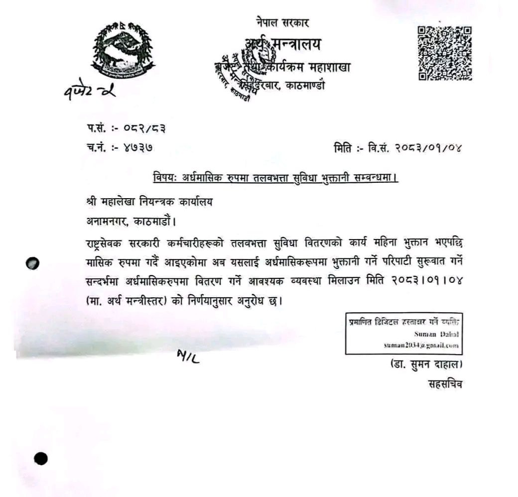 22 काठमाडौं । अब सरकारी कर्मचारीहरूले १५/१५ दिनमा तलबभत्ता पाउने भएका छन् । अर्थ मन्त्रालयले गत शुक्रबार उक्त निर्णय गरेको हो । यसका लागि महालेखा नियन्त्रक कार्यालयलाई समेत निर्णय कार्यान्वयनका लागि परिपत्र गरिसकेको सहसचिव डा. सुमन दाहालले जानकारी दिए । सम्बन्धित पोस्टहरू सडक विस्तार कार्यका कारण वीरगन्जमा तीन दिन विद्युत्... वीरगञ्जमा डोजर चलाएकोप्रति कांग्रेस नेता द्विवेदीको आक्रोशः ‘यो... सर्वोच्चको फैसलाले कांग्रेसलाई एकताबद्ध बनाउने बाटो खुल्यो :... आइतबार र शनिबारको सार्वजनिक बिदा अस्पतालमा पनि लागू... घरायसी सामानमा भन्सार लगाएको भन्दै वीरगन्जमा विरोध, नाका... आजदेखि ‘शून्य बाँकी फाइल अभियान’ शैक्षिक उन्नयनको सन्देशसहित प्याब्सन पर्साद्वारा ‘लेगेसी अवार्ड’ वितरण आफू र आफ्नो परिवारमाथि सम्पत्ति शुद्धिकरण सम्बन्धी भ्रामक... खोजी अभियान : चार दिनमा दुई सय २६... वीरगञ्जमा निकालियो हनुमान जयन्तीको ऐतिहासिक शोभा यात्रा, सुरक्षा... शंकर ग्रुपका सञ्चालक शंकरलाल अग्रवाल पक्राउ सरकारले तीव्र रफ्तारमा काम गरिरहेको छ: अर्थमन्त्री डा...